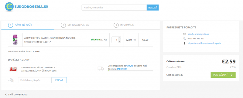 Hľadáte drogérii? Skúste Eurodrogeria, kde uplatníte zľavy a zľavové kódy a nakúpite všetky drogistický tovar za skvelé ceny. Nakupujte veci na holenie, kozmetiku, osobnú hygienu, darčekové sety, čistiace prostriedky, produkty pre deti a mnoho ďalšieho. K nákupu využite dopravu zdarma.
